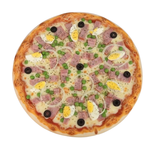 Recheada com muçarela, presunto, ovo cozido, ervilha e cebola picada. Um prato completo e tradicional, ideal para quem aprecia a riqueza dos ingredientes da verdadeira pizza Portuguesa!